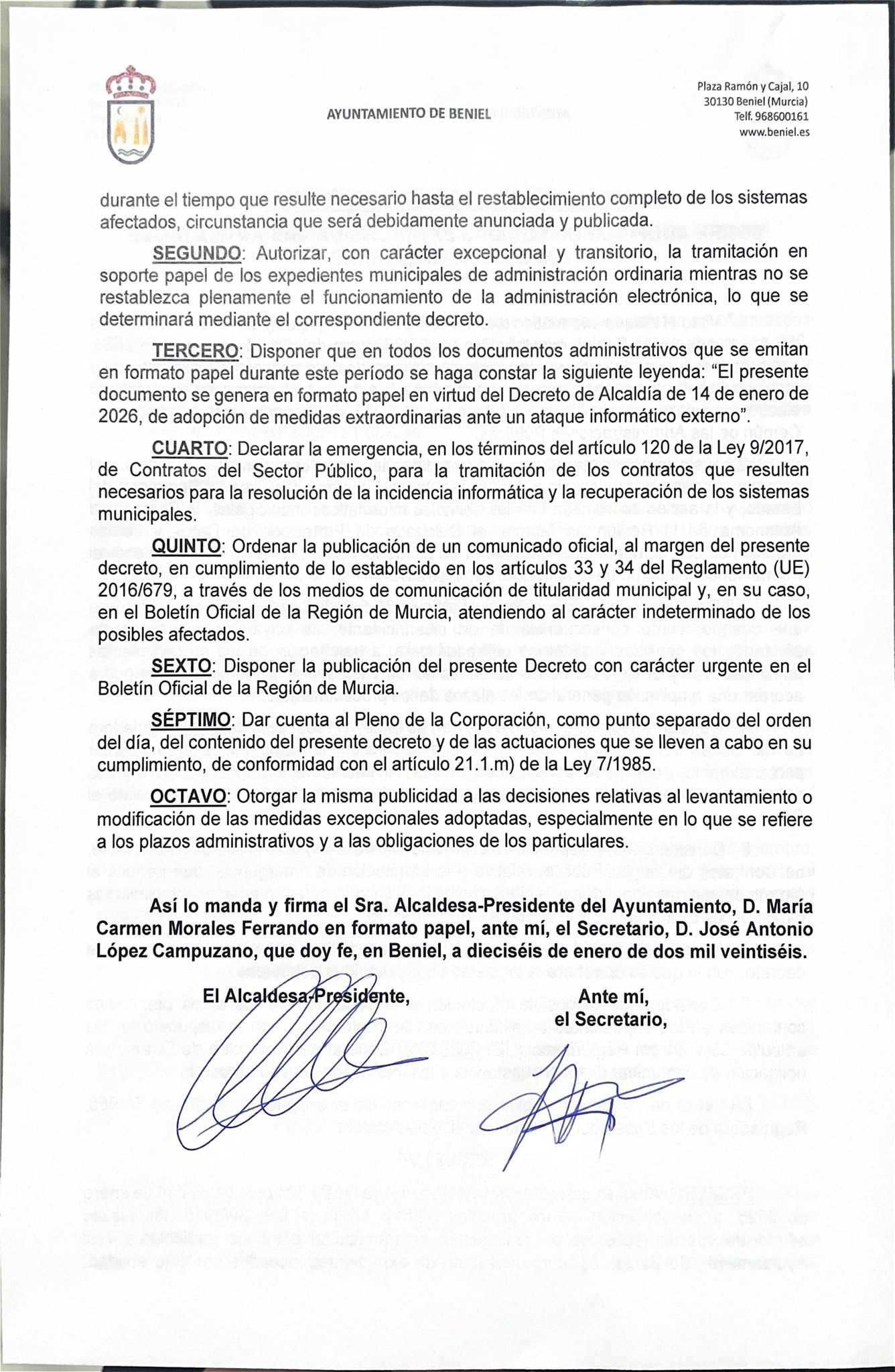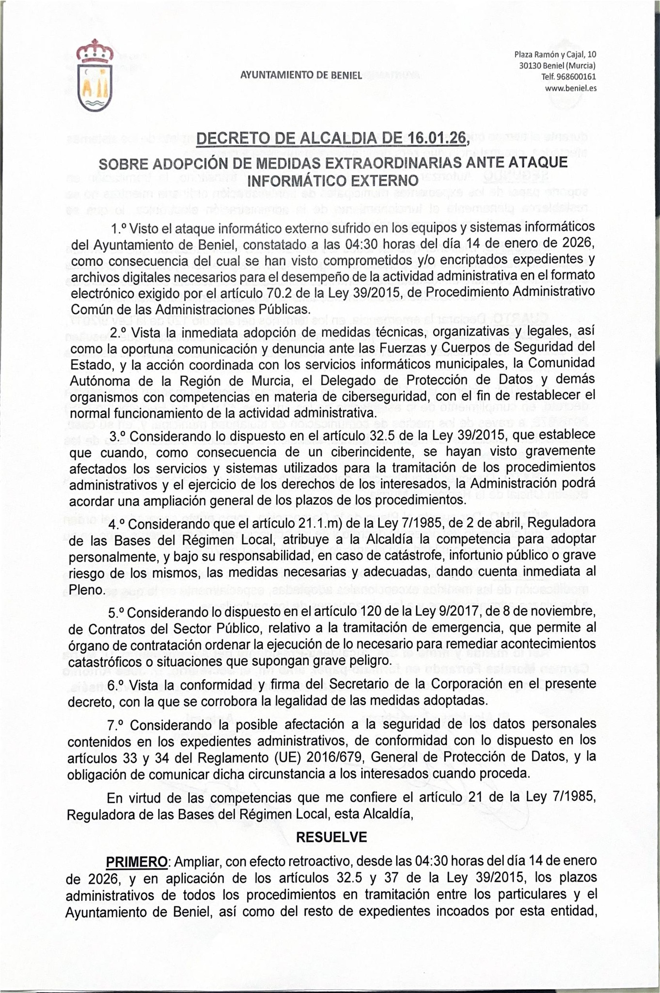 Tras el incidente de ciberseguridad registrado en los sistemas informáticos municipales, la alcaldesa de Beniel, Mari Carmen Morales, ha dictado un decreto de medidas extraordinarias.
