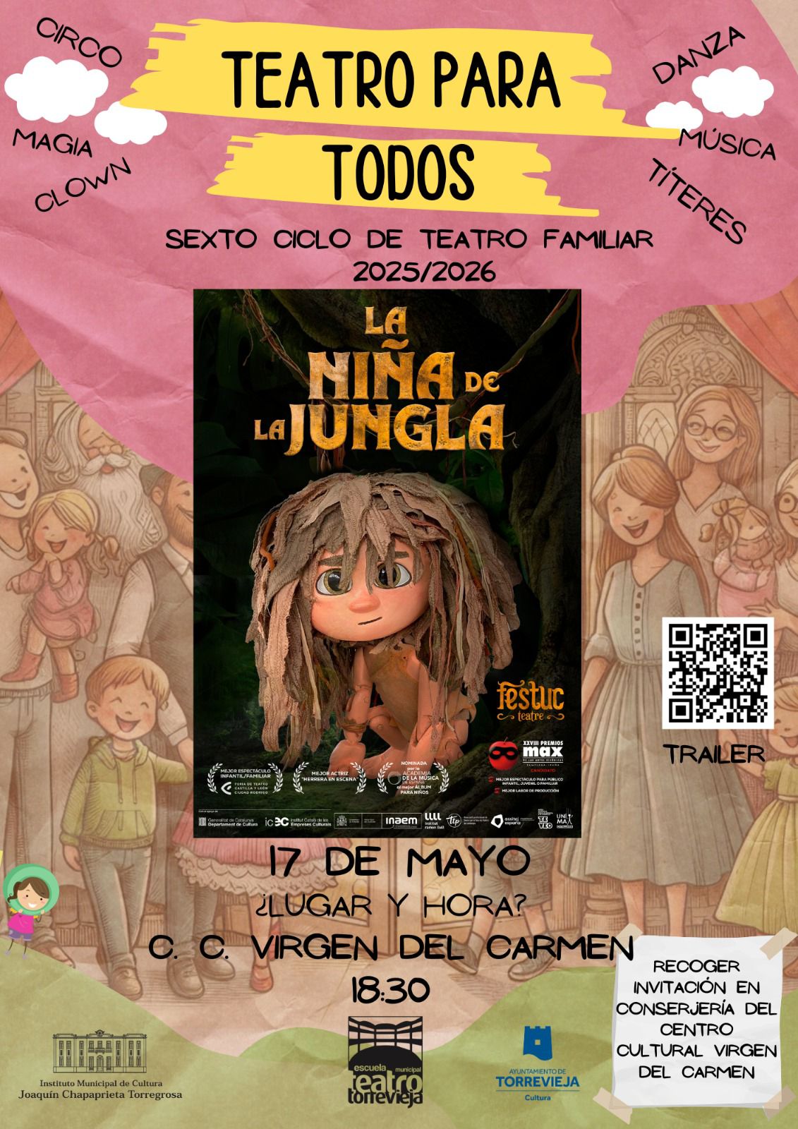 Todo lo bueno se acaba y el próximo espectáculo del domingo, 17 de mayo, a las 18:30 horas, en el Centro Cultural Virgen del Carmen cierra el ciclo de Teatro para Todos del curso 2025-2026. Este último espectáculo es de títeres con el título “La niña de la jungla” de la conocida compañía “Festuc Teatre”. La edad recomendada es de 5/6 años en adelante.
