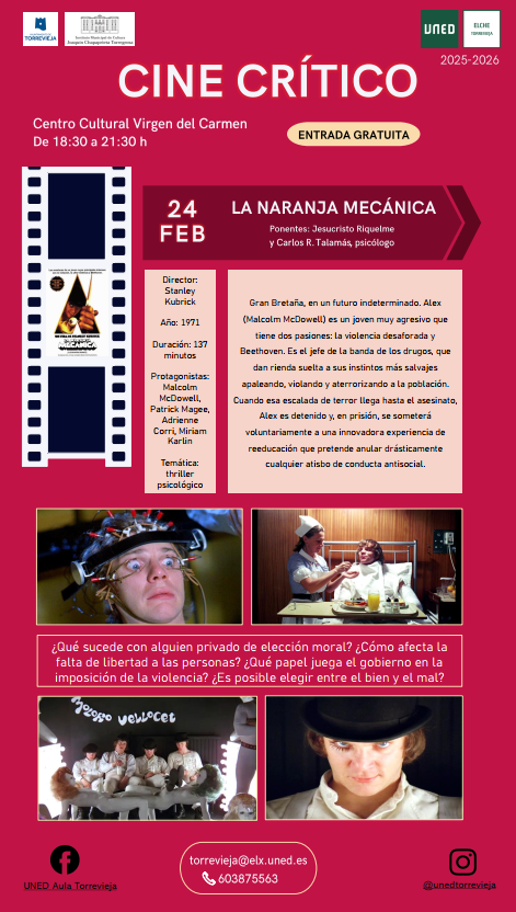 En esta ocasión se proyectará la película La naranja mecánica, dirigida por Stanley Kubrick y estrenada en 1971. El filme, protagonizado por Malcolm McDowell, constituye uno de los grandes referentes del thriller psicológico contemporáneo y plantea profundas cuestiones éticas y sociales que continúan vigentes.