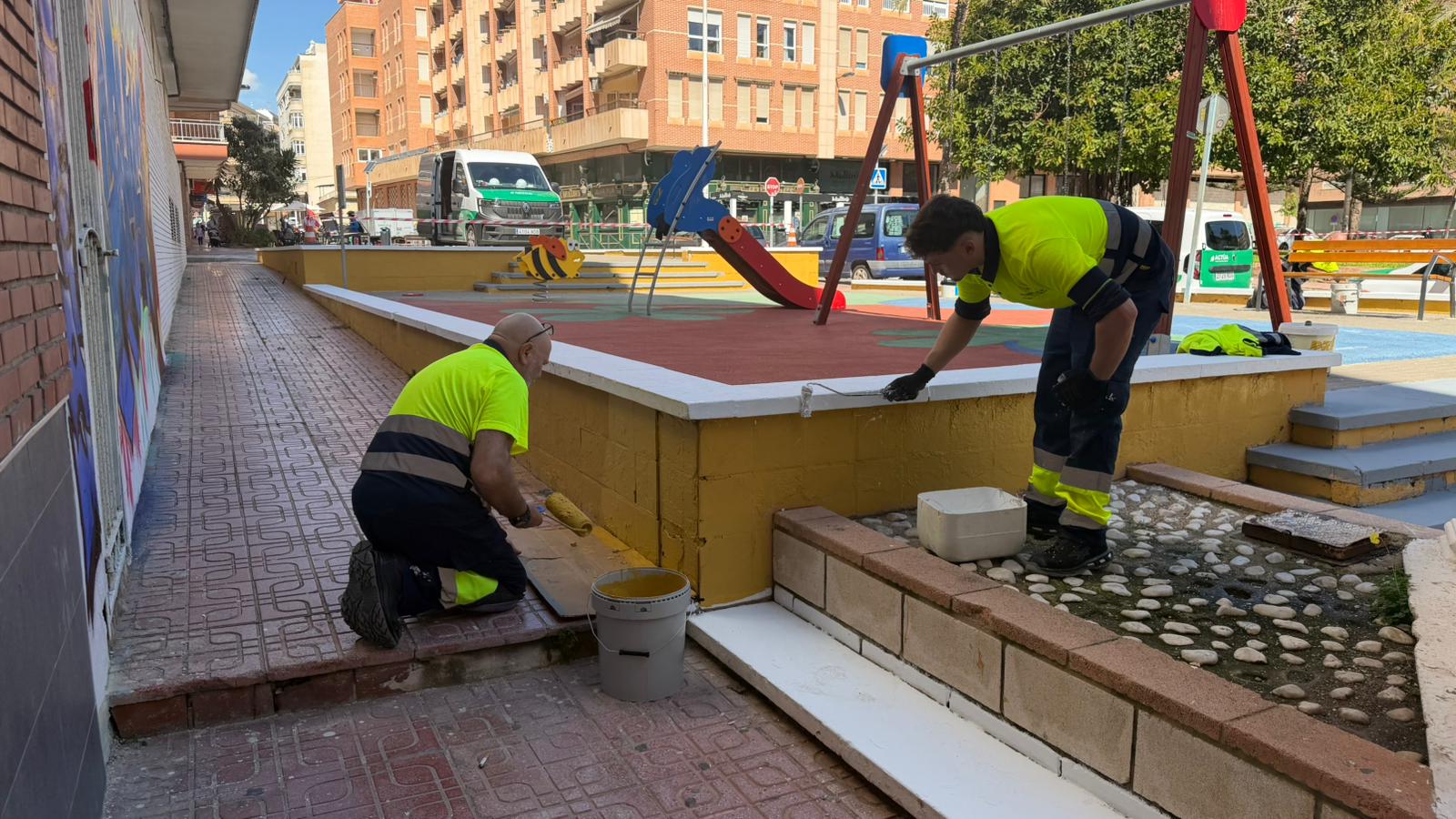 Dentro de los trabajos realizados, también se ha llevado a cabo la poda de un ficus de gran porte existente en la plaza, así como labores de pintura y acondicionamiento general, junto con diferentes tareas de mantenimiento tanto en la propia plaza como en el parque anexo, garantizando su correcto estado y conservación.