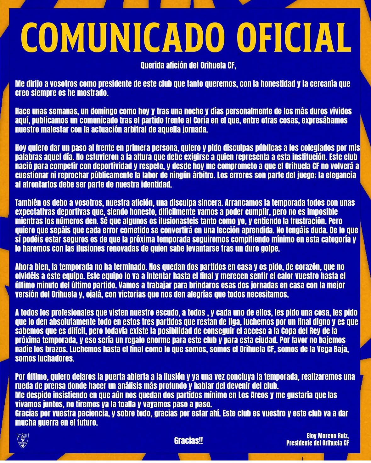 Además el presidente del club oriolano Eloy Moreno ha emitido un comunicado en el que trata diferentes asuntos interés para el club.