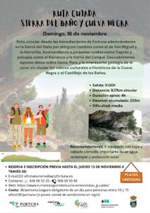 La cita tendrá lugar el domingo, 16 de noviembre, y los participantes descubrirán algunos datos sobre fauna, flora y la interesante geología de la zona, sin olvidar los valores culturales e históricos de la Cueva Negra y el Castillejo de los Baños.