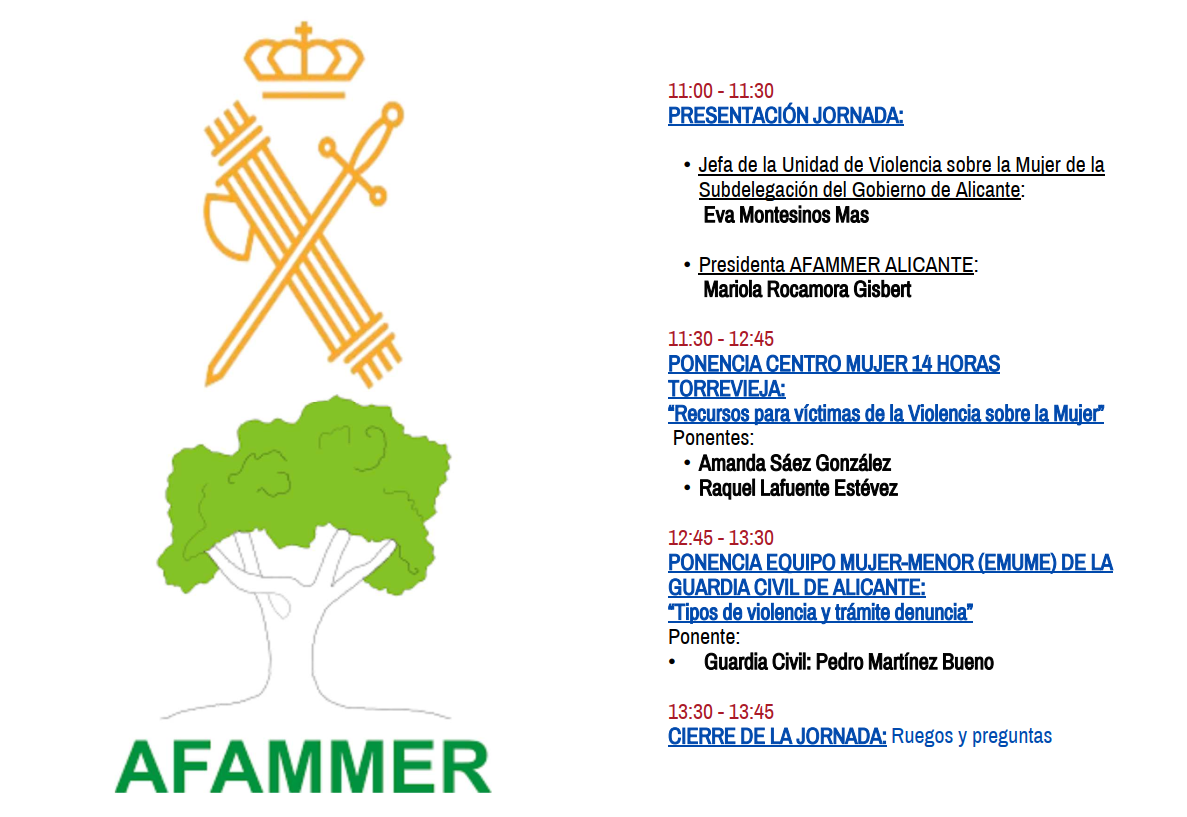 La Jornada será presentada por Eva Montesinos, Jefa de la Unidad de Violencia de Género sobre la Mujer de la Subdelegación del Gobierno en Alicante y Mariola Rocamora, Presidenta de la Asociación AFAMMER en Alicante.