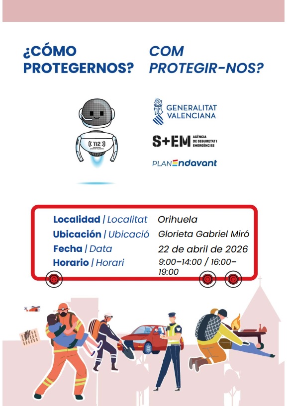 El Ayuntamiento de Orihuela, a través de la Concejalía de Emergencias que dirige Víctor Valverde, colabora en una campaña de sensibilización impulsada por la Conselleria de Emergencias e Interior de la Generalitat Valenciana para fomentar la cultura de la autoprotección entre la ciudadanía. La iniciativa se desarrollará este miércoles, 22 de abril, en la Glorieta Gabriel Miró, frente al colegio Andrés Manjón.