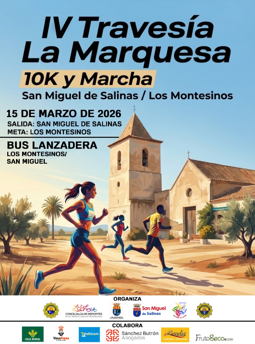 San Miguel de Salinas y Los Montesinos presentan la IV Travesía de La Marquesa, una carrera de 10 km y marcha senderista que se celebrará el 15 de marzo de 2026 a las 10:00 h, con salida en San Miguel y recorrido por la emblemática Ermita de La Marquesa.