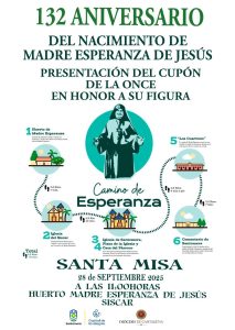 Para conmemorar el 132° aniversario del nacimiento de Madre Esperanza de Jesús, la Organización Nacional de Ciegos Españoles (ONCE) presentará un cupón que llevará su imagen. El evento tendrá lugar el próximo domingo 28 de septiembre en el Huerto Madre Esperanza de Santomera.