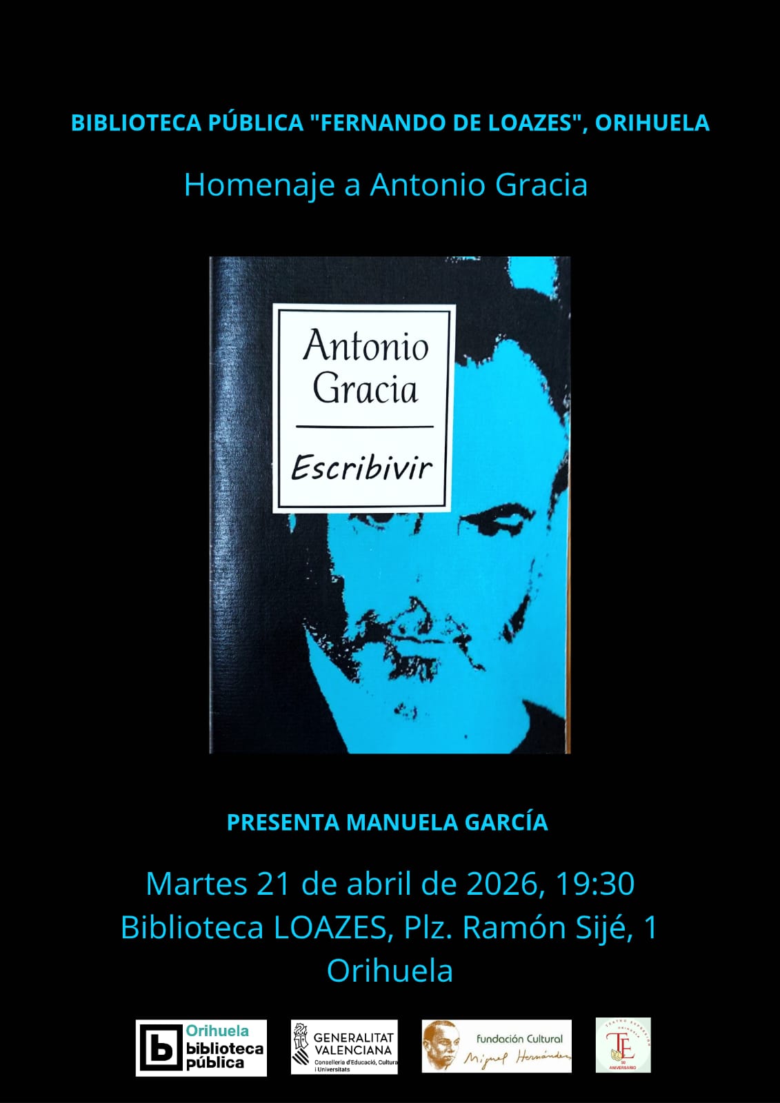 Por otra parte, Teatro Expresión, en colaboración con la Biblioteca Pública “Fernando de Loazes” y la Fundación Cultural Miguel Hernández organizará el próximo martes 21 de abril a partir de las 19:30 horas el homenaje a Antonio Gracia, ESCRIBIVIR, que se desarrollará en la Sala Histórica de la Biblioteca Pública “Fernando de Loazes”.