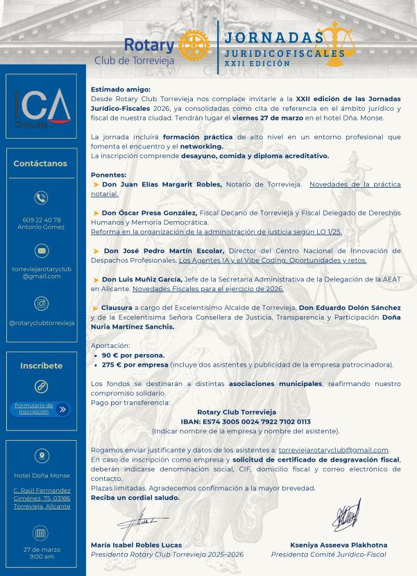 Estas jornadas, organizadas por el Rotary Club Torrevieja, se han consolidado a lo largo de más de dos décadas como una cita de referencia para la actualización de conocimientos en materias jurídicas y tributarias, así como un espacio de encuentro entre profesionales que desarrollan su actividad en el ámbito legal, fiscal y empresarial tanto en el municipio como en el conjunto de la comarca.